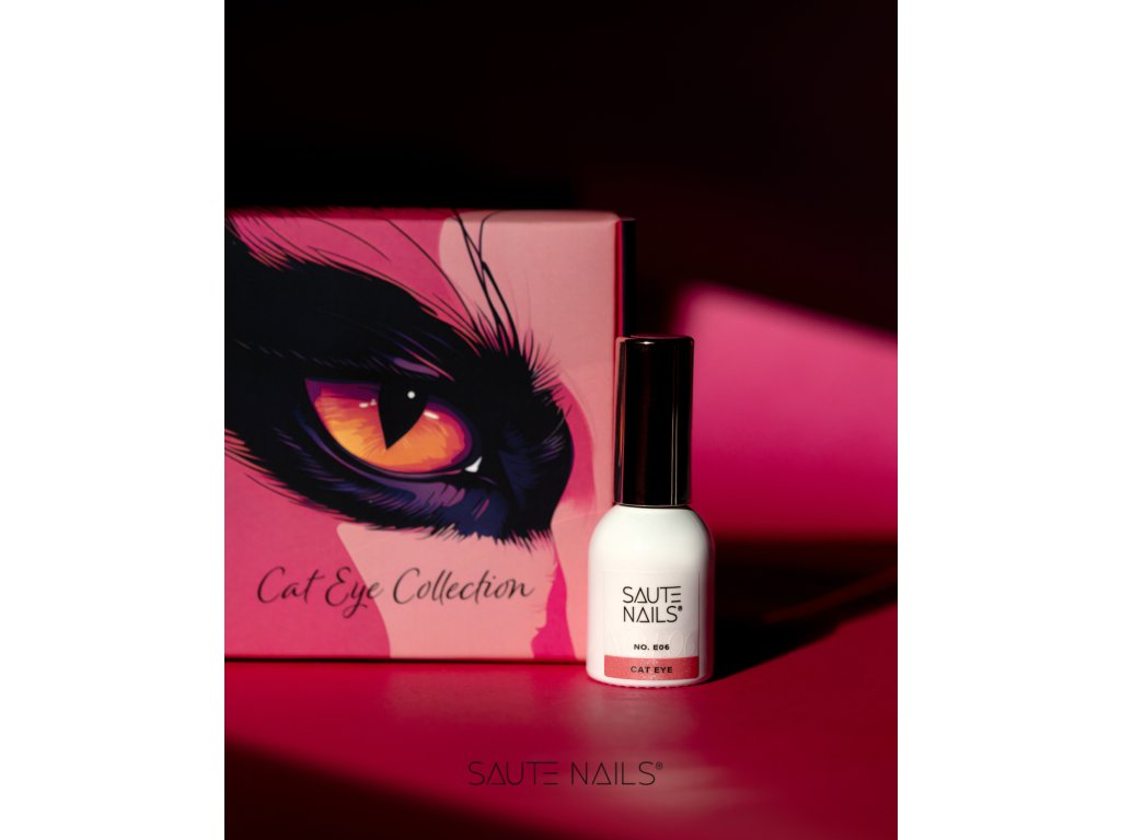 Cat Eye E06 je intenzivní oranžový odstín, který při použití magnetu vytváří efekt záře v odstínu ztlumeného stříbra jemně prolomeného růžovým tónem. Lak lze použít s magnetem pro dosažení světelné linie, nebo bez něj – jako třpytivou, lesklou barvu.