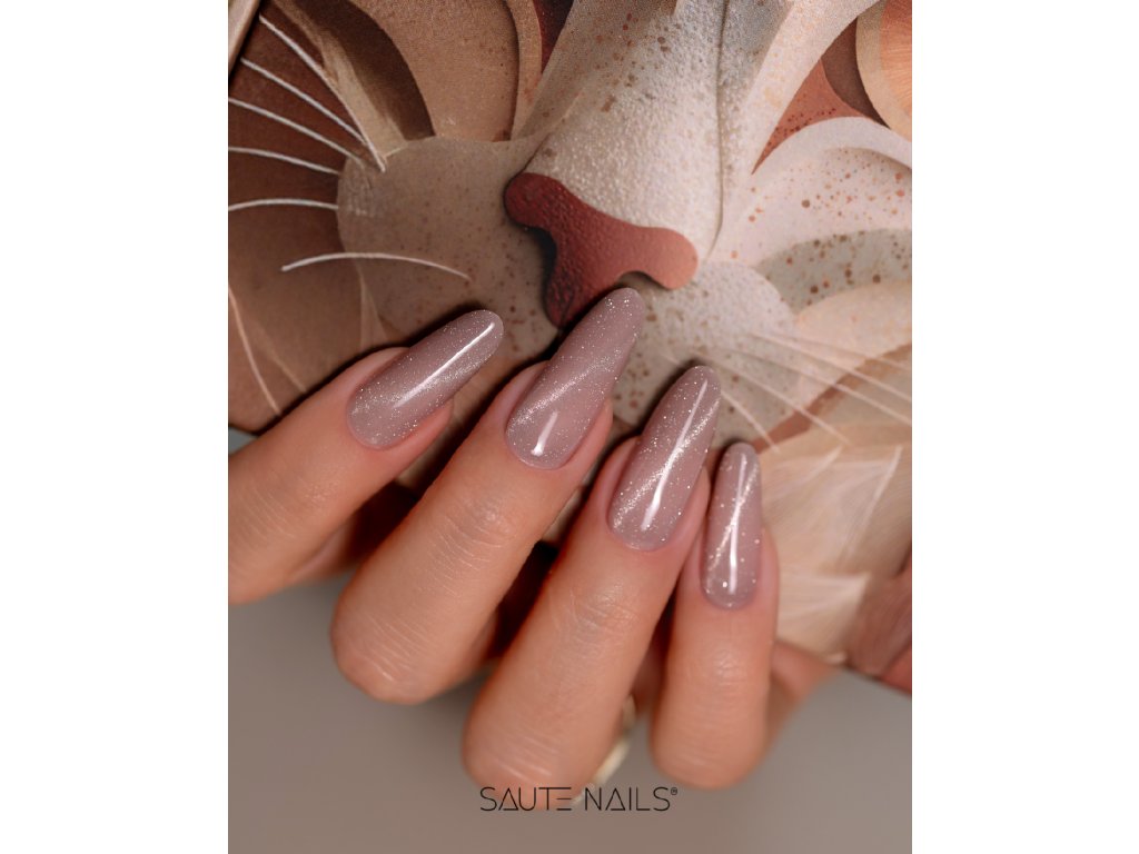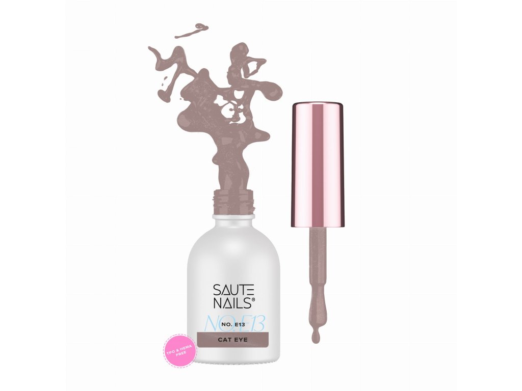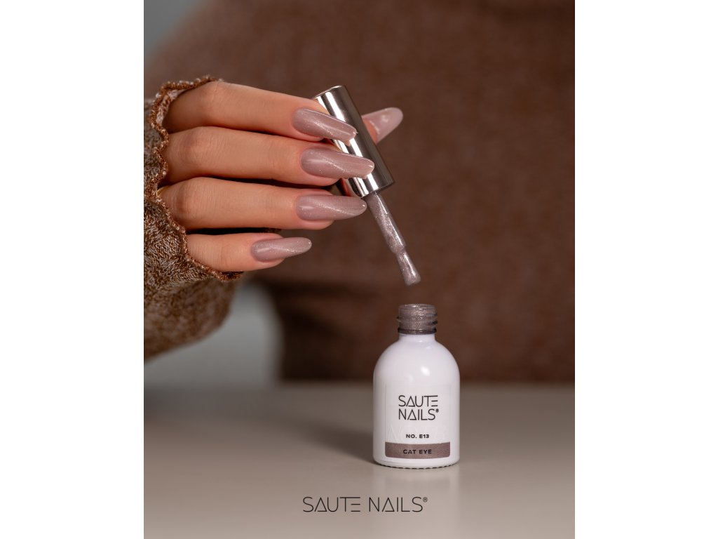 Cat Eye E13 je chladný odstín hnědé s příměsí šedé, obohacený o stříbrný třpyt, který se vytváří pomocí magnetu. Při použití bez magnetu nabízí efekt rovnoměrné, třpytivé hnědé s šedými tóny. Je to vyvážená a elegantní barva, která dokonale zapadá do podzimní palety a hodí se jak pro klasické, tak pro moderní stylizace.