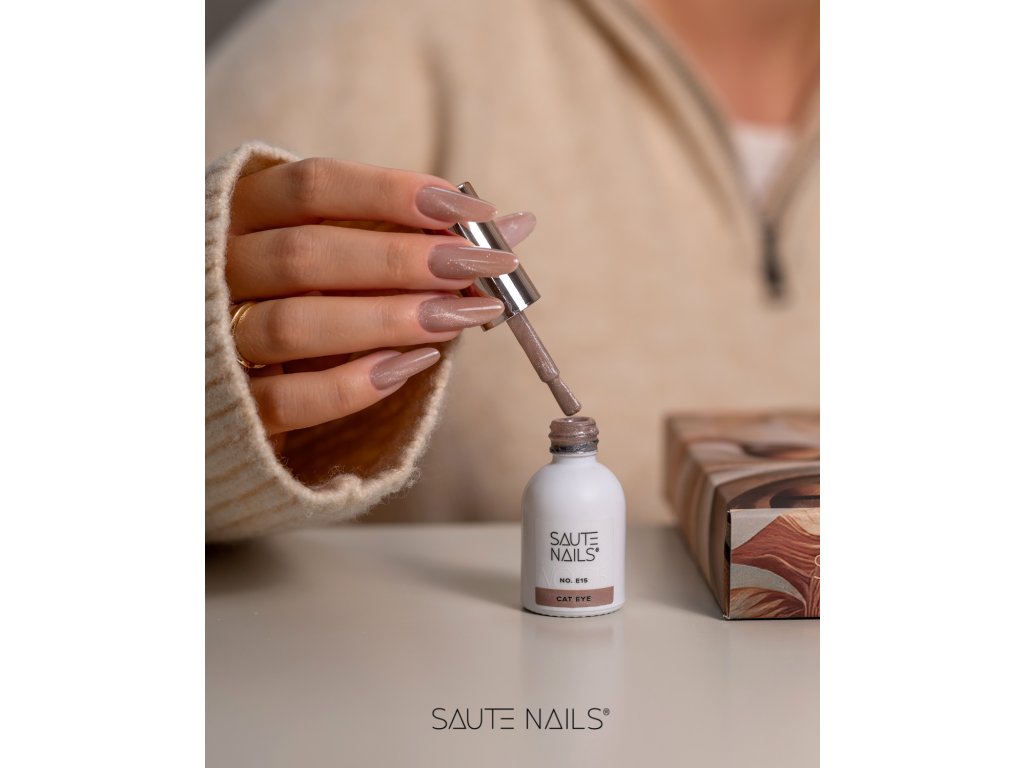 Cat Eye E15 je světlý odstín teplé béžové se stříbrným třpytem, který se vytváří pomocí magnetu. Při použití bez magnetu poskytuje rovnoměrný, třpytivý efekt. Je to jemná a nadčasová barva, která se perfektně hodí pro neutrální i elegantní stylizace a krásně podtrhuje přirozenou krásu nehtů.