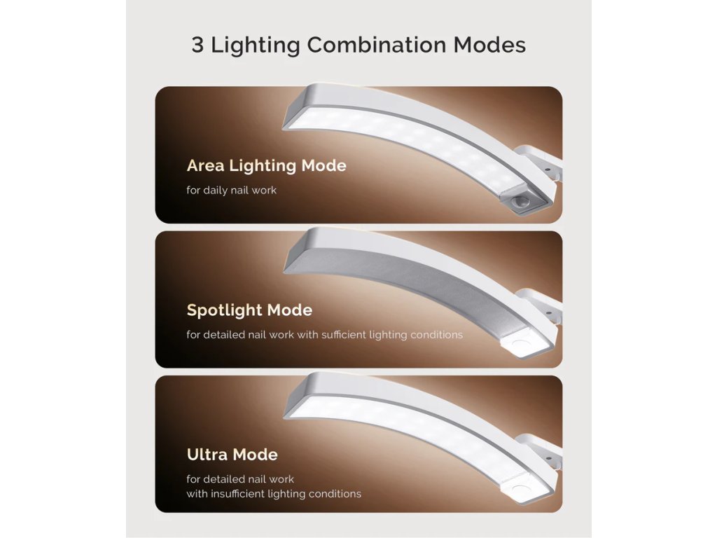 Moderní manikúrní stolní lampa s možností nastavení jasu i barevné teploty (studená, neutrální, teplá). Nabízí tři režimy osvětlení pro různé potřeby – od širokého nasvícení celé plochy až po detailní bodové světlo. Flexibilní ramena umožňují pohodlné nastavení úhlů a zajišťují precizní práci bez nežádoucích stínů. Součástí je navíc i odnímatelná mini UV/LED lampička s magnetickým uchycením a časovačem na 30s nebo 60s, která je ideální na rychlé vytvrzení jednoho nehtu.